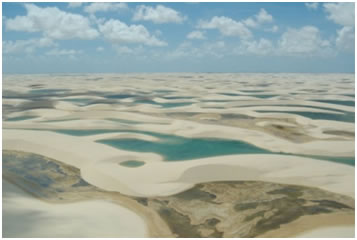 Пустыня со сложным, как для нас, названием Ленсойс-Мараньенсис — это специфическая пустыня с лагунами, находящаяся в Бразилии. Конечно, в это реально сложно поверить, но данная пустыня буквально полнится лагунами c водой. Потрясающий внешний вид создает сильный контраст белых песчаных дюн и голубых, даже лазурных лагун.